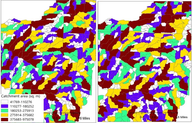 图3 使用自动(左)和人工(右)hDEMs生成的流域边界差异