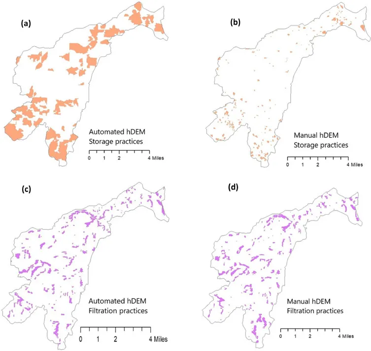 本研究指导从业者根据可用预算、时间限制和水质目标,选择合适的水力调节DEM,以进行不同规模的高效BMPs规划。对hDEMs的分析证实,通过识别受阻水流和布置最佳数量的决口线,精确模拟水文连通性,可以实现更精确的选址和更具成本效益的最佳管理方案规划,如储存和生物过滤实践。另一方面,诸如过滤等处理方法不会受到水力调节方法的显著影响。验证结果和地面实况表明,使用人工hDEM生成的流量网络有助于在农场范围内制定更准确、更有针对性的实施计划。另一方面,自动化hDEM可以有效地使用适当的代码快速设置决口线,并且更适合提供子流域规模的实施计划。