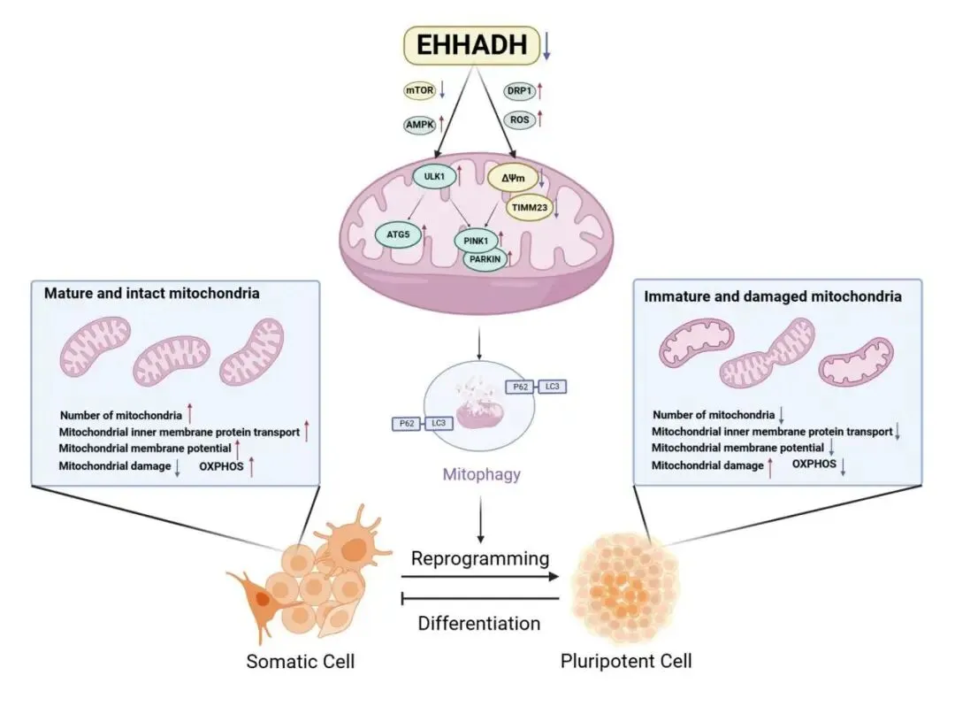 图. 脂肪酸氧化酶Ehhadh通过激活线粒体自噬调控细胞命运重塑示意图
