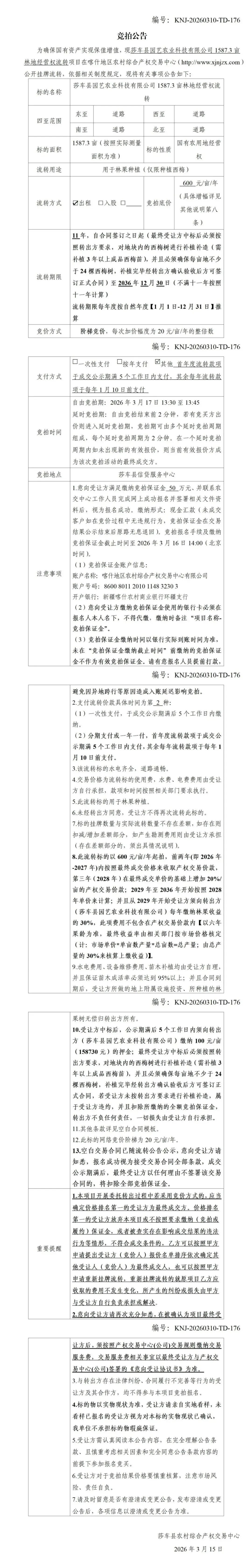 >莎车县园艺农业科技有限公司1587.3亩林地经营权流转项目竞拍公告