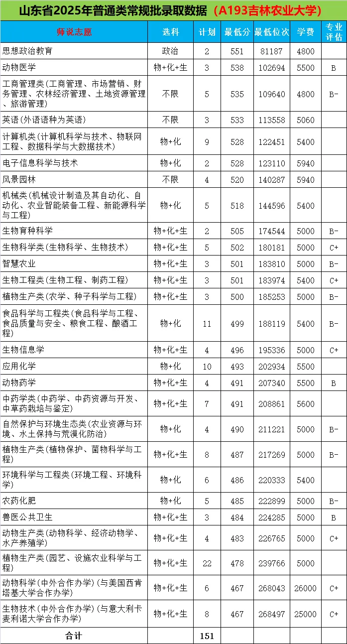 吉林农业大学2025年全国校友会排名第183名,吉林省排名第4名。2025年在山东省招生专业最低录取分467分(268497)-551分(81187),其中普通专业最低分478分(239766)。