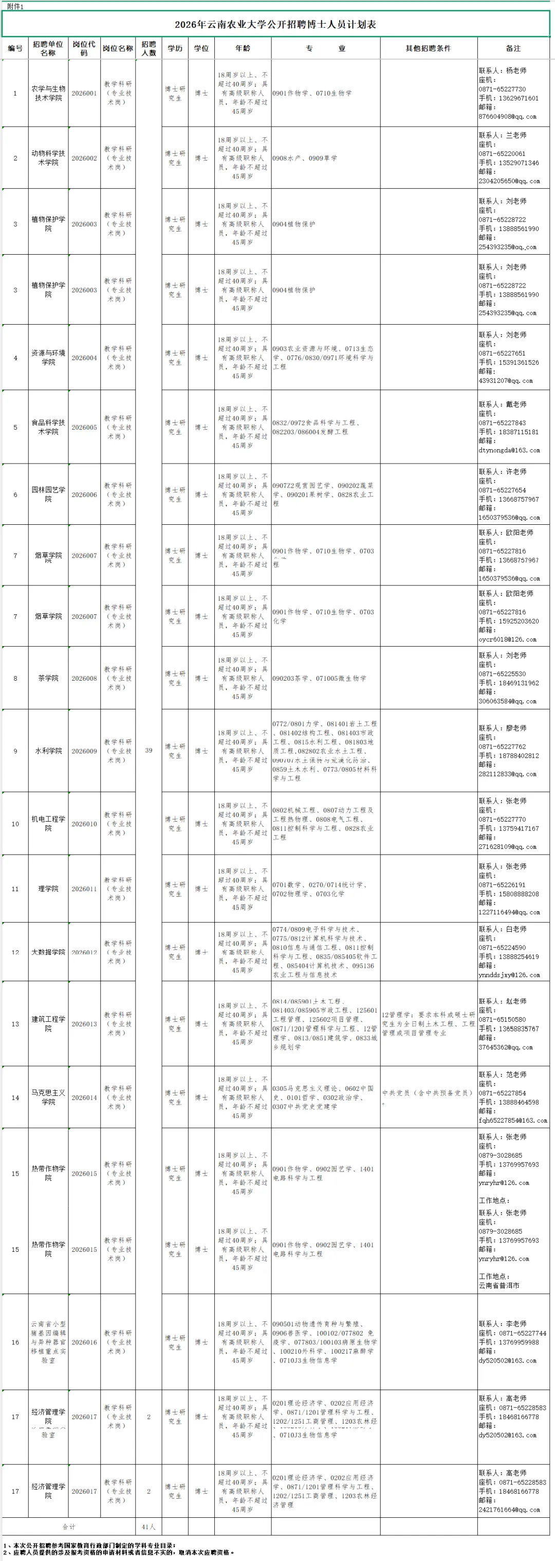 按照《事业单位公开招聘人员暂行规定》(人事部令第6号)、《云南省事业单位公开招聘工作人员办法》(云人社发〔2016〕182号)等法律法规,根据工作需要,经云南省教育厅审核同意报云南省人力资源和社会保障厅核准,2026年云南农业大学计划面向社会公开招聘博士人员41名,现将有关事项公告如下: