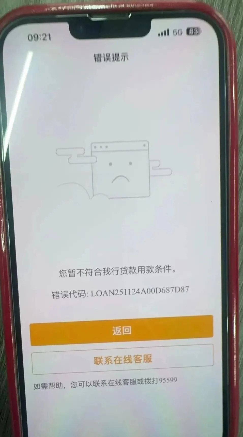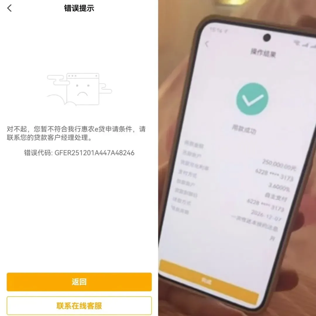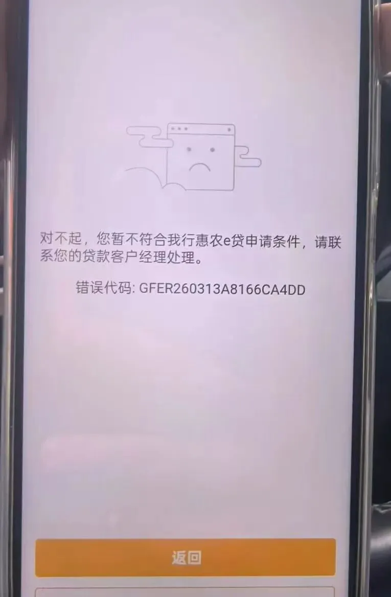 办理农行贷款(惠农系列/助业快贷)初审通过了,额度也批好了,签约也成功了,就差最后一步点击用款,出这个错误代码。你说恼火难受不?这时候怎么办呢?