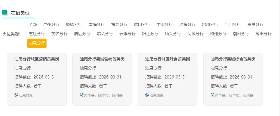 包括城区营销菁英岗、城区综合菁英岗和广州城区客服经理岗。主要为我行城区机构培养和储备零售、对公金融营销服务人才,财富管理、投行资管、国际金融、绿色金融、业务运营、信息科技、财务会计、风险控制、法律合规等专业或管理型人才。