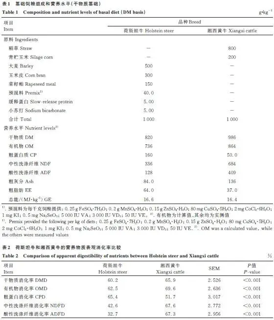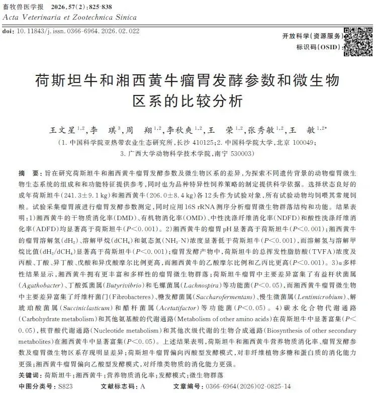 关键词:荷斯坦牛 ; 湘西黄牛 ; 营养物质消化率 ; 发酵模式 ; 微生物群落