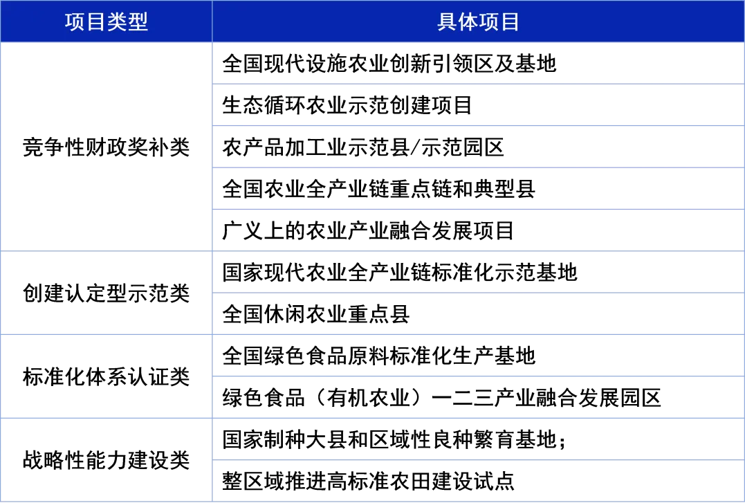 当前,国家在农业领域设立了一系列政策支持项目,涵盖了农业产业发展的各个方面,可分为以下几类。
