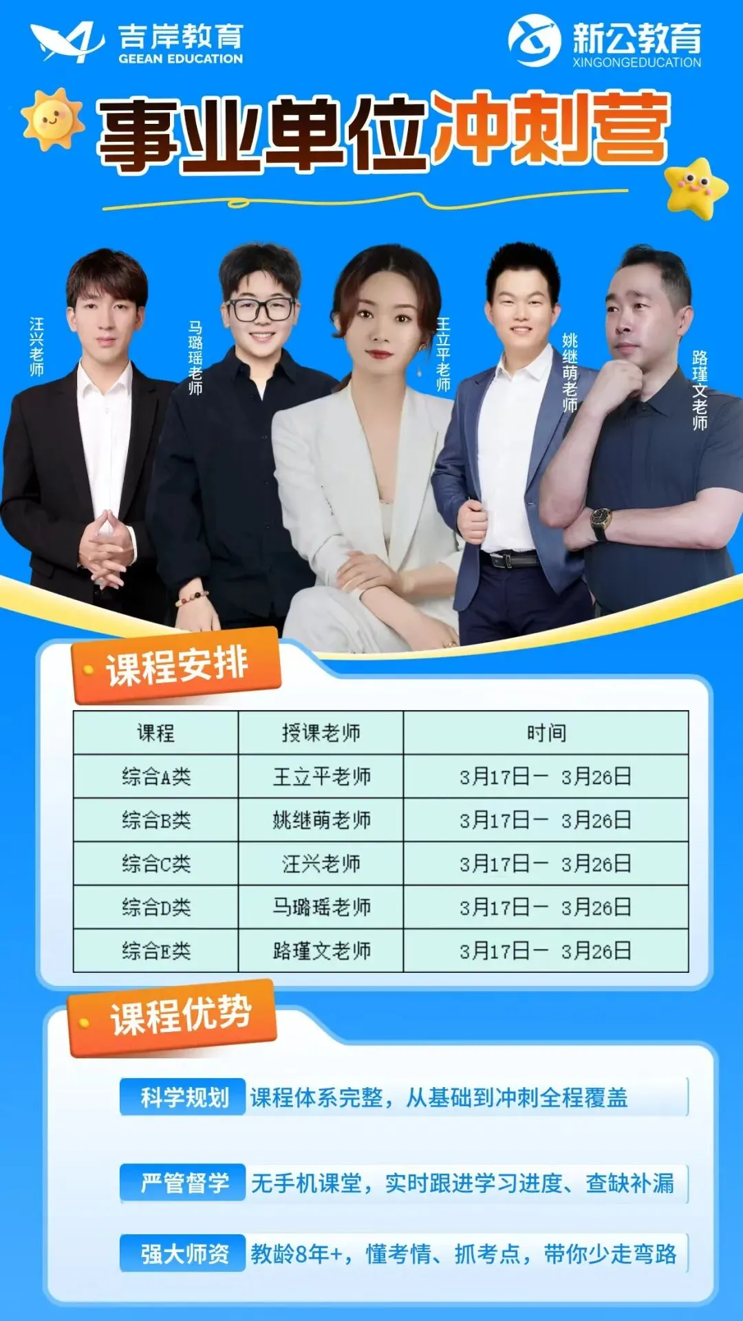 课程设置精准分层,遵循 “夯实基础→系统强化→讲练→刷题→全真模考冲刺” 的科学路径,适配不同基础学员需求。事业单位ABCDE全类别开课。