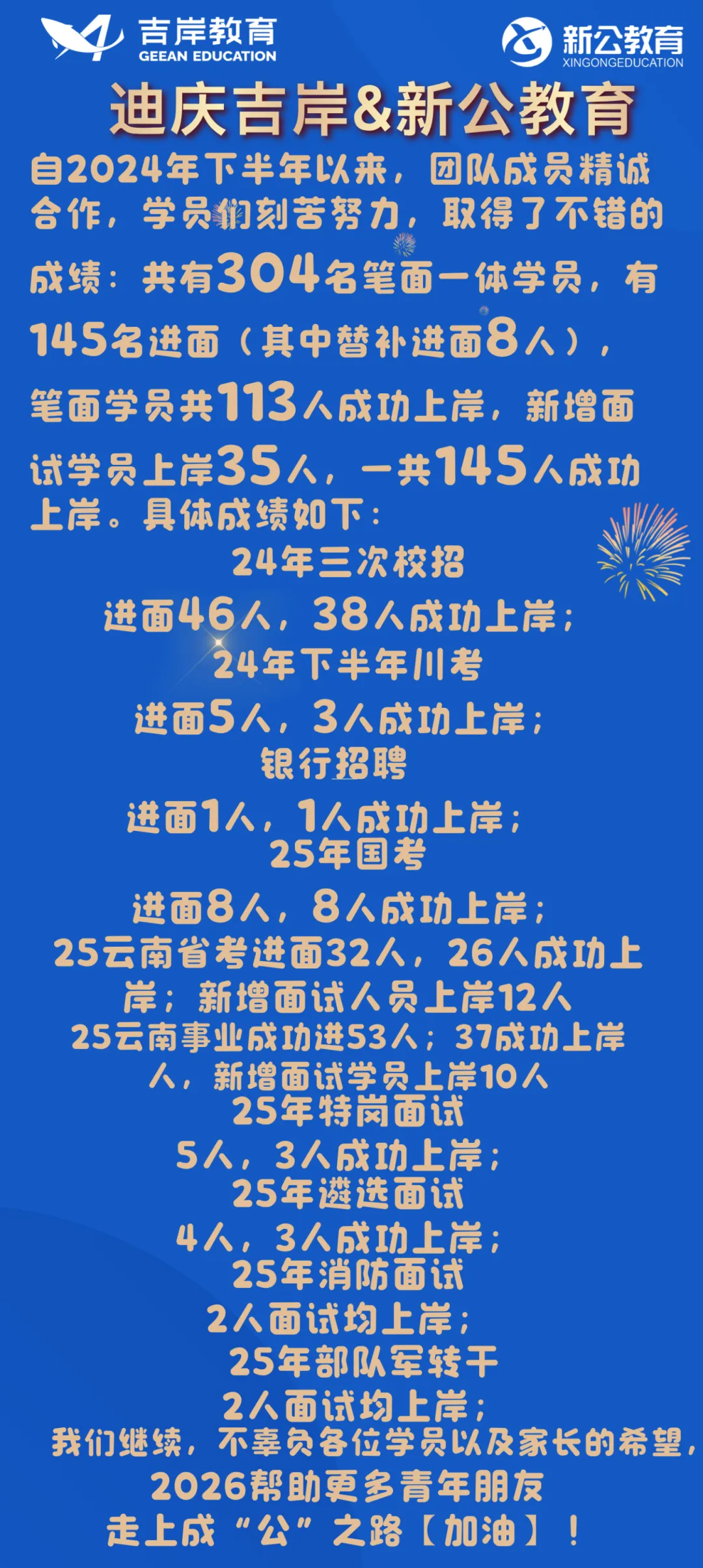 迪庆吉岸&新公教育,经营团队与授课教师均为云南本土公考行业资深从业者,平均教龄8年以上,教研功底扎实、授课经验丰富,精准把握云南各类公职考试命题规律。