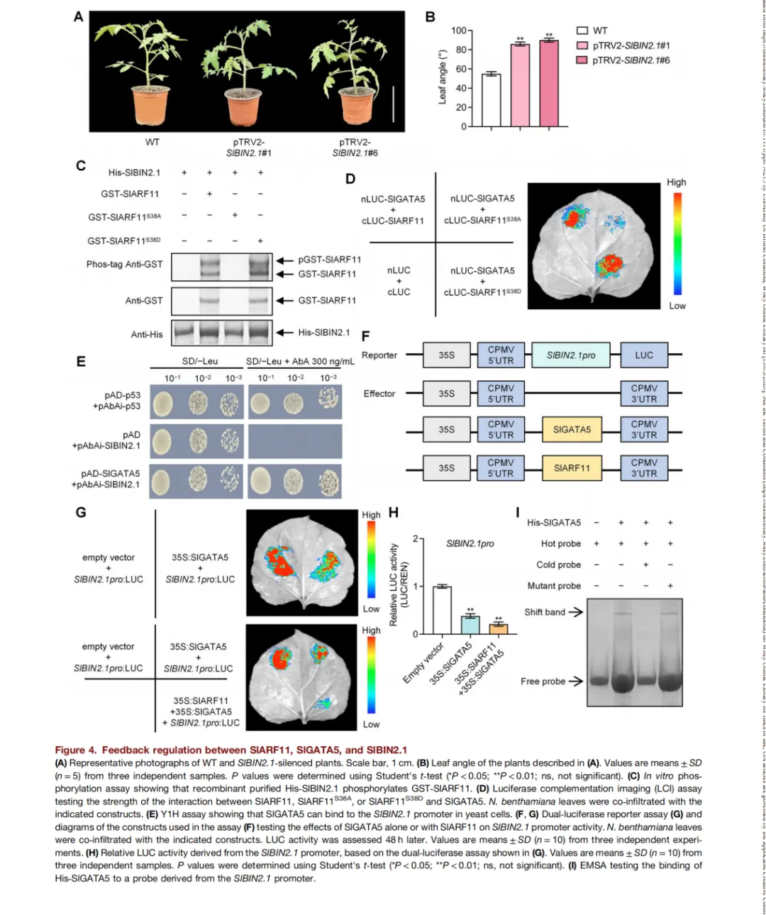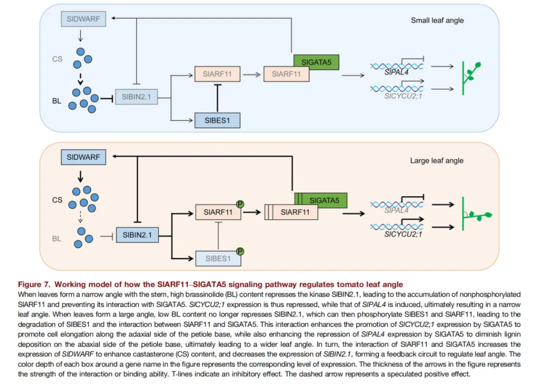 SlARF11介导的叶片角度调控涉及叶柄基部的细胞伸长和木质素沉积,显著促进SlGATA5介导的U型细胞周期蛋白(SlCYCU2;1)和苯丙氨酸氨裂解酶4(SlPAL4)的表达。此外,SlBIN2.1位于SlARF11上游并磷酸化SlARF11,从而增强SlARF11与SlGATA5的相互作用。位于SlBIN2.1下游的RASSINOSTERIOD INSENSITIVE1-EMS-SUPPRESSOR 1 (SlBES1)可抑制SlARF11的表达。
