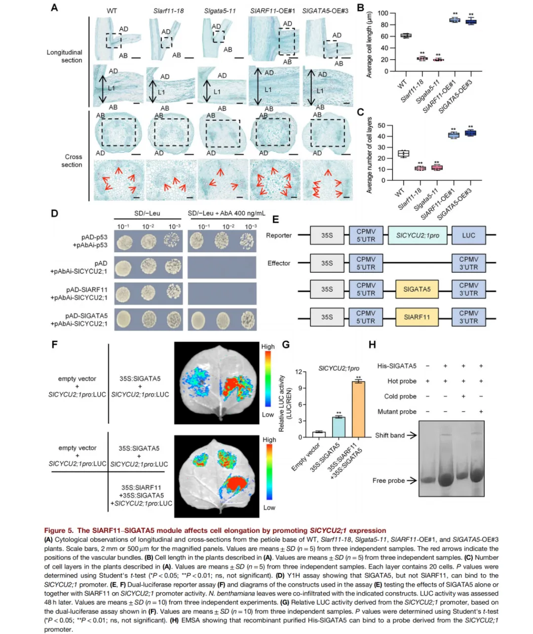 Auxin response factor (ARF) 和油菜素内酯(BR)在植物生长发育中起重要作用,例如决定叶片角度。然而,ARFs与BR信号在调控番茄叶片角度中的关系尚不明确。本研究报道,auxin-responsive factor 11 (SlARF11)正向调控番茄叶片角度,并对BR表现出超敏性。SlARF11是一种非经典ARF,在叶柄基部的上表皮侧高表达。SlARF11与SlGATA5相互作用并位于其上游,SlGATA5是一种GATA转录因子,通过直接结合其下游基因BRASINOSTEROID-INSENSITIVE 2 (SlBIN2.1)的启动子,从而抑制番茄中SlBIN2.1的表达。