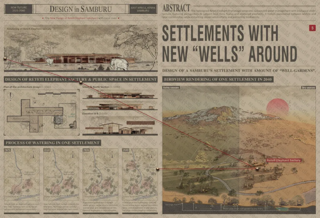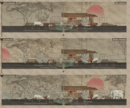 该项目位于肯尼亚长期遭受干旱的桑布鲁(Samburu)地区,旨在应对气候变化和土地侵蚀所加剧的水资源短缺以及人类与野生动物之间的冲突问题。项目提出建立节水型庭院花园,通过收集和储存雨水来形成局部微气候环境,并通过管道系统埃瓦索尼罗河相连接。