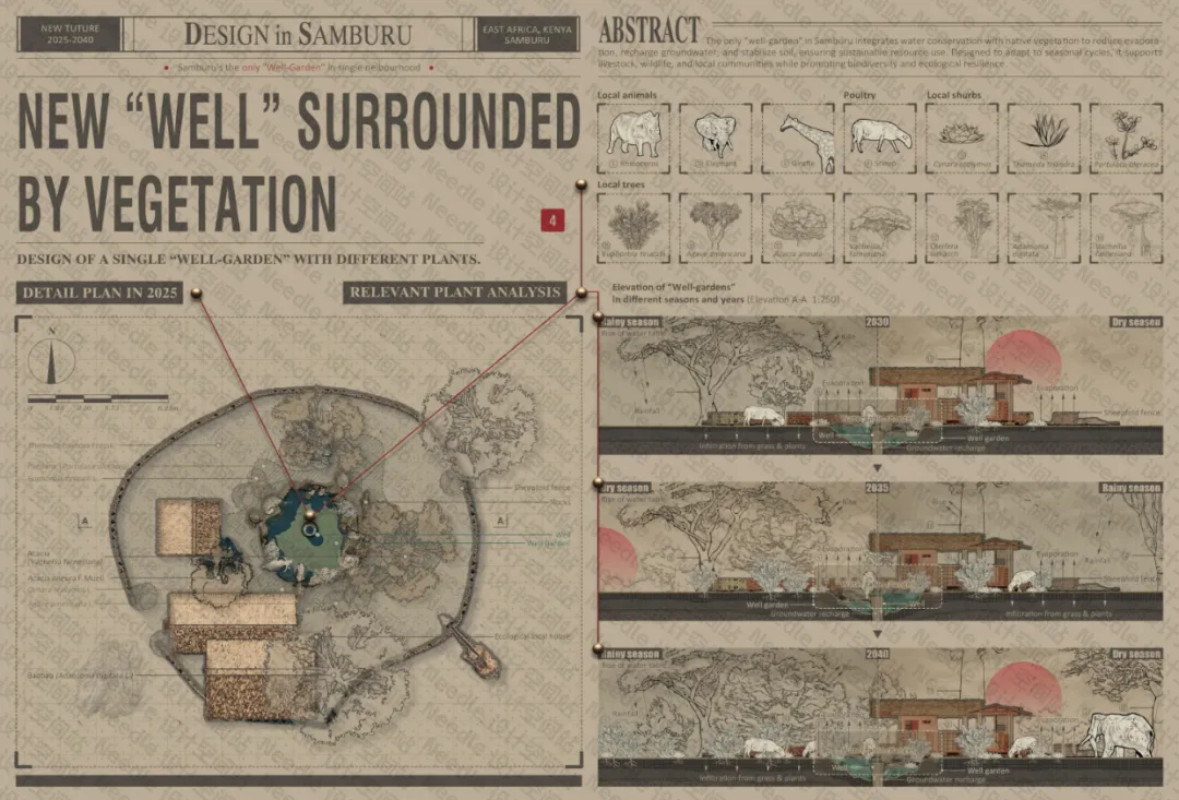 桑布鲁的庭院花园(Homestead Garden)将节水措施与本土植被相结合,以减少蒸发、补充地下水并稳定土壤,从而实现资源的可持续利用。该系统依据季节变化进行适应性设计,不仅能够支持牲畜、野生动物以及当地社区的用水需求,还能够促进生物多样性提升与生态系统的韧性。