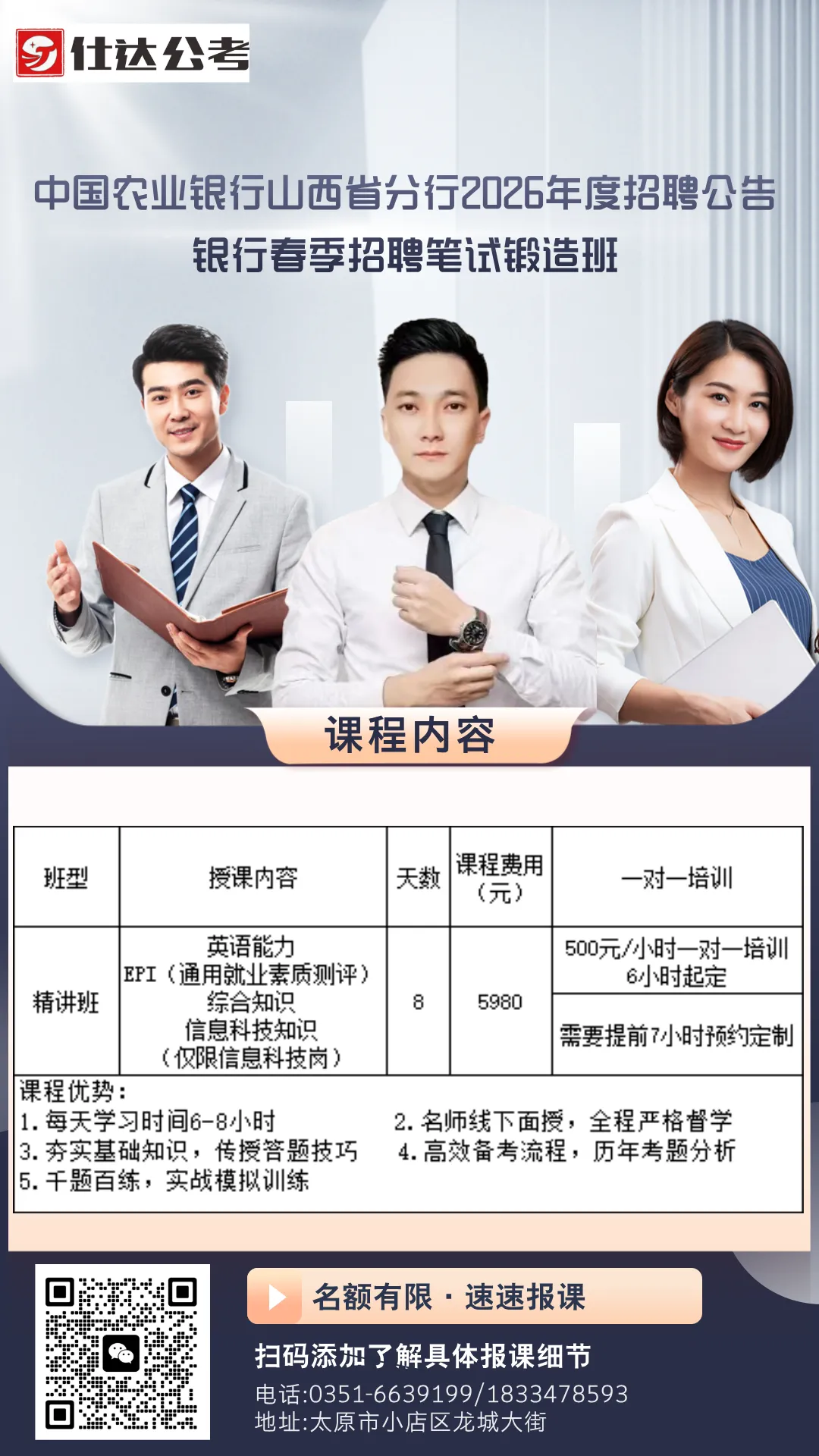 中国农业银行山西省分行以服务三晋人民和地方经济发展为己任,深入践行金融工作政治性、人民性要求,全力做好金融“五篇大文章”,始终坚守“服务乡村振兴的领军银行、服务实体经济的主力银行”两大定位,全面实施“三农”普惠、绿色金融、数字经营三大战略,持续为全省转型发展和谱写中国式现代化山西实践贡献农行力量。现面向海内外诚聘优秀人才,热忱期待与您携手同行、共创辉煌!