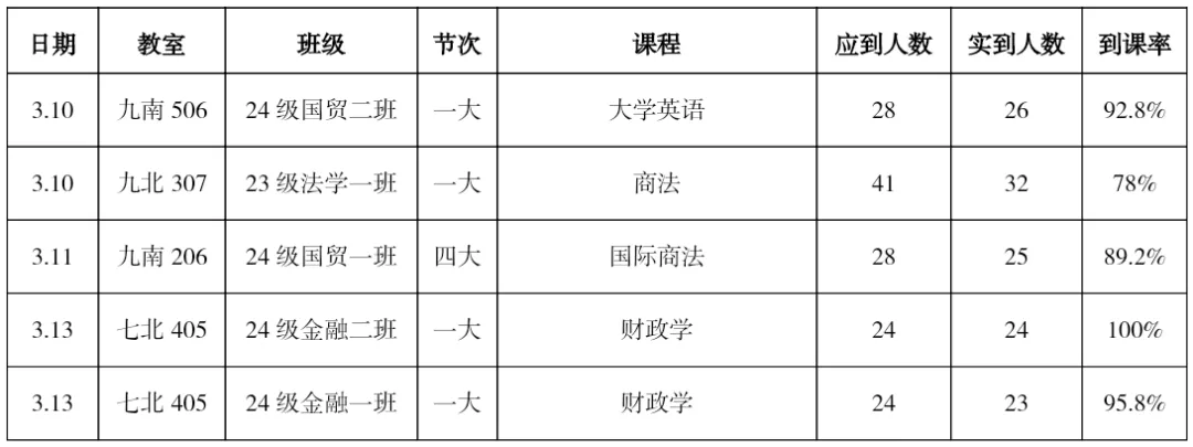 课堂抽检3次,共计5节次,抽检到课率89.6%。其中,到课率90%以下(除请假情况)1节次。