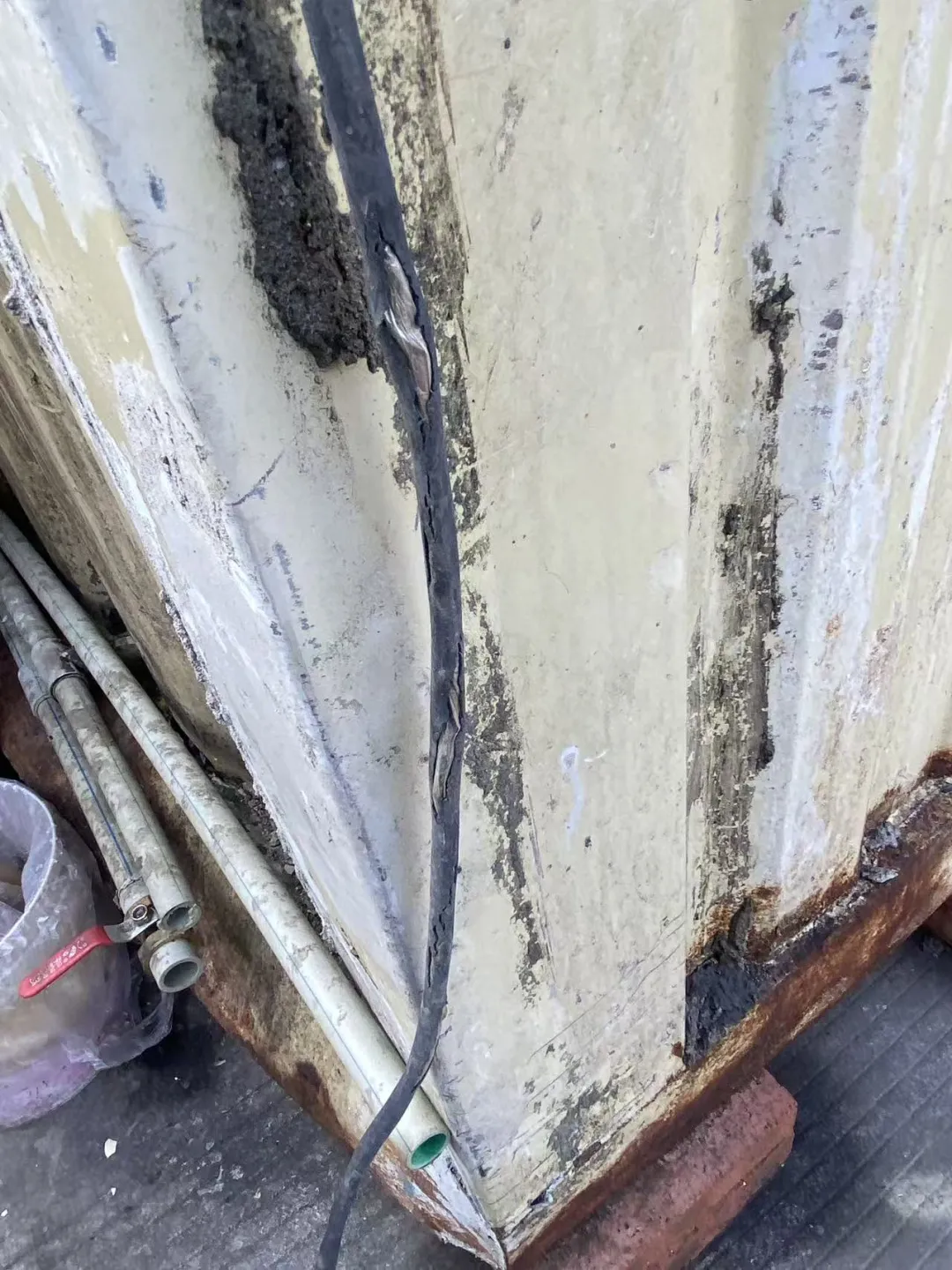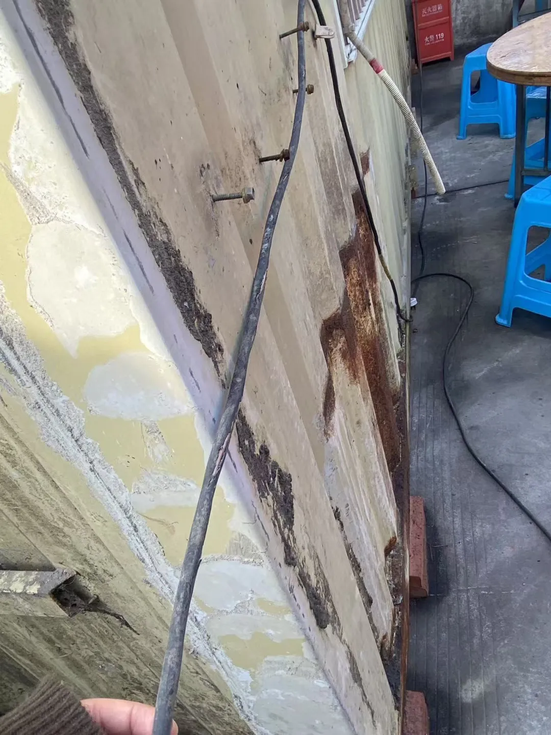 2、厨房外临时用电电源线路表皮老化破损严重;