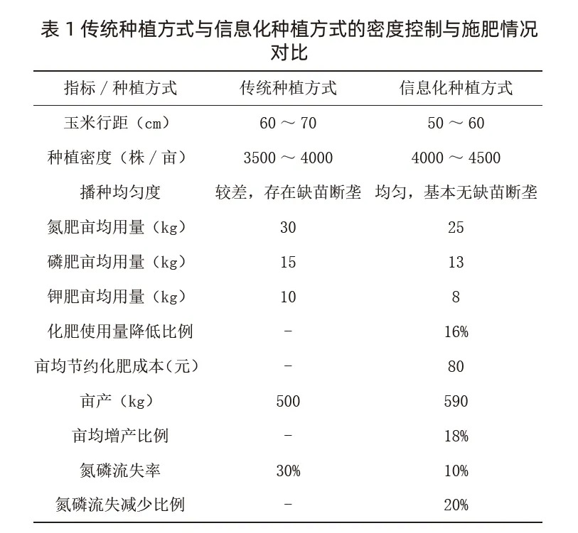 精准施肥基于GPS技术和施肥机械,根据土地实际情况进行变量施肥。以嘉祥县纸坊镇3000亩示范区为例,通过土壤养分传感器检测发现,部分区域土壤氮、磷、钾含量差异较大,氮含量在0.1%~0.15%之间,磷含量在0.05%~0.08%之间,钾含量在0.8%~1.2%之间。精准施肥后,示范区玉米在生长中期叶片颜色更绿、长势更旺,叶片叶绿素含量比传统施肥提高15%~20%。与传统施肥相比,亩均增产18%,达到590 kg,化肥使用量降低16%,亩均节约化肥成本80元,氮磷流失减少了20%,有效提高了肥料利用效率,减少了环境污染[3]。具体数据如表1所示。