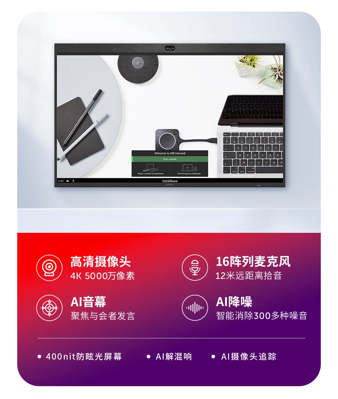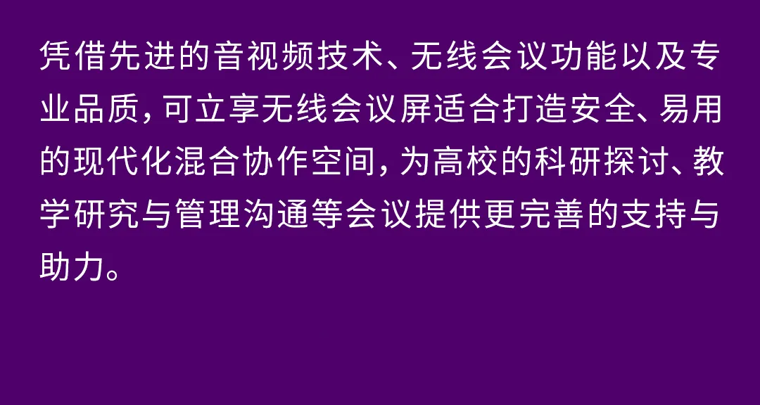 可立享无线会议屏具有专业级的音质与画质,能够很好地满足本地及远程会议需求。经过一段时间的使用,客户对可立享无线会议屏的远距离拾音、AI降噪、高清摄像头及AI视图模式等实用功能非常认可与满意,特别是300多种降噪的能力,能够把教室周围的车流声、施工噪音、走路声等通通去除干净,保证一个干净的远程沟通体验。