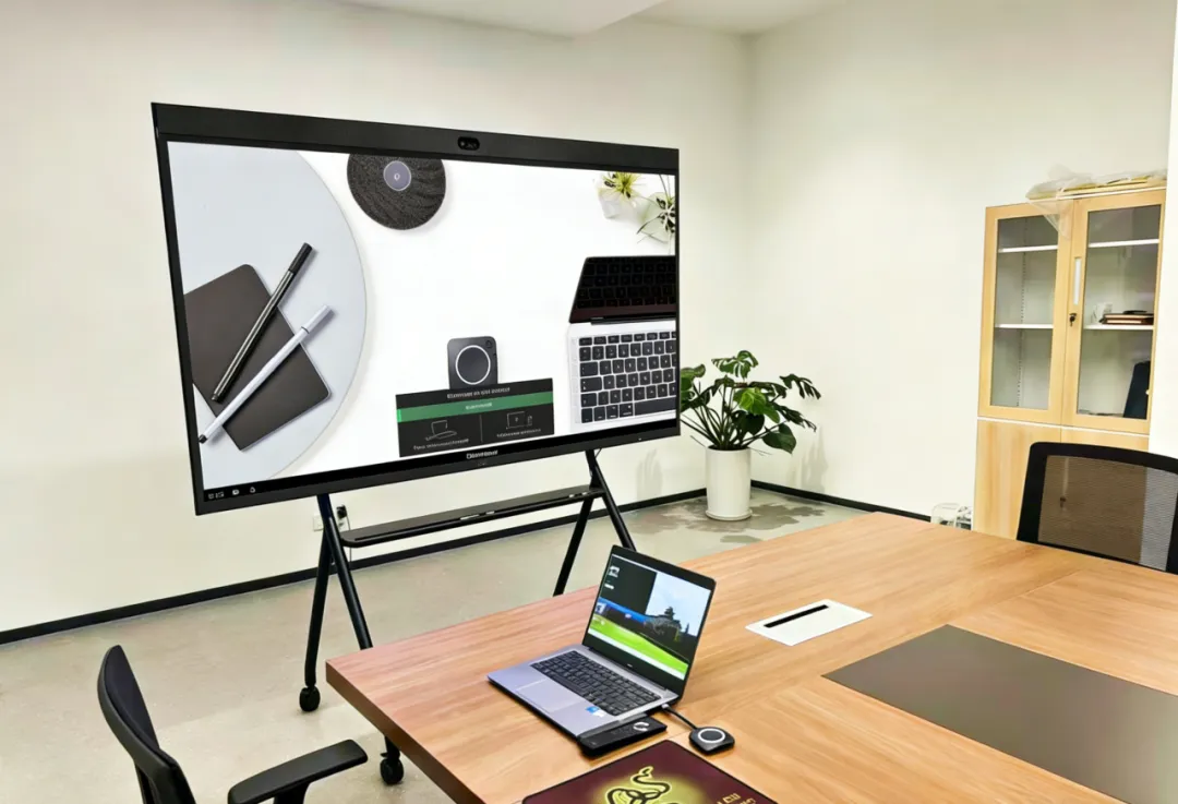 可立享无线会议屏可以灵活应用于各种空间或场景,比如在临时会议室或报告厅,与其他设备配合使用。它不仅能将视频信号环出至更大尺寸的LED或投影画面,还能无缝连接分体式音视频外设等。