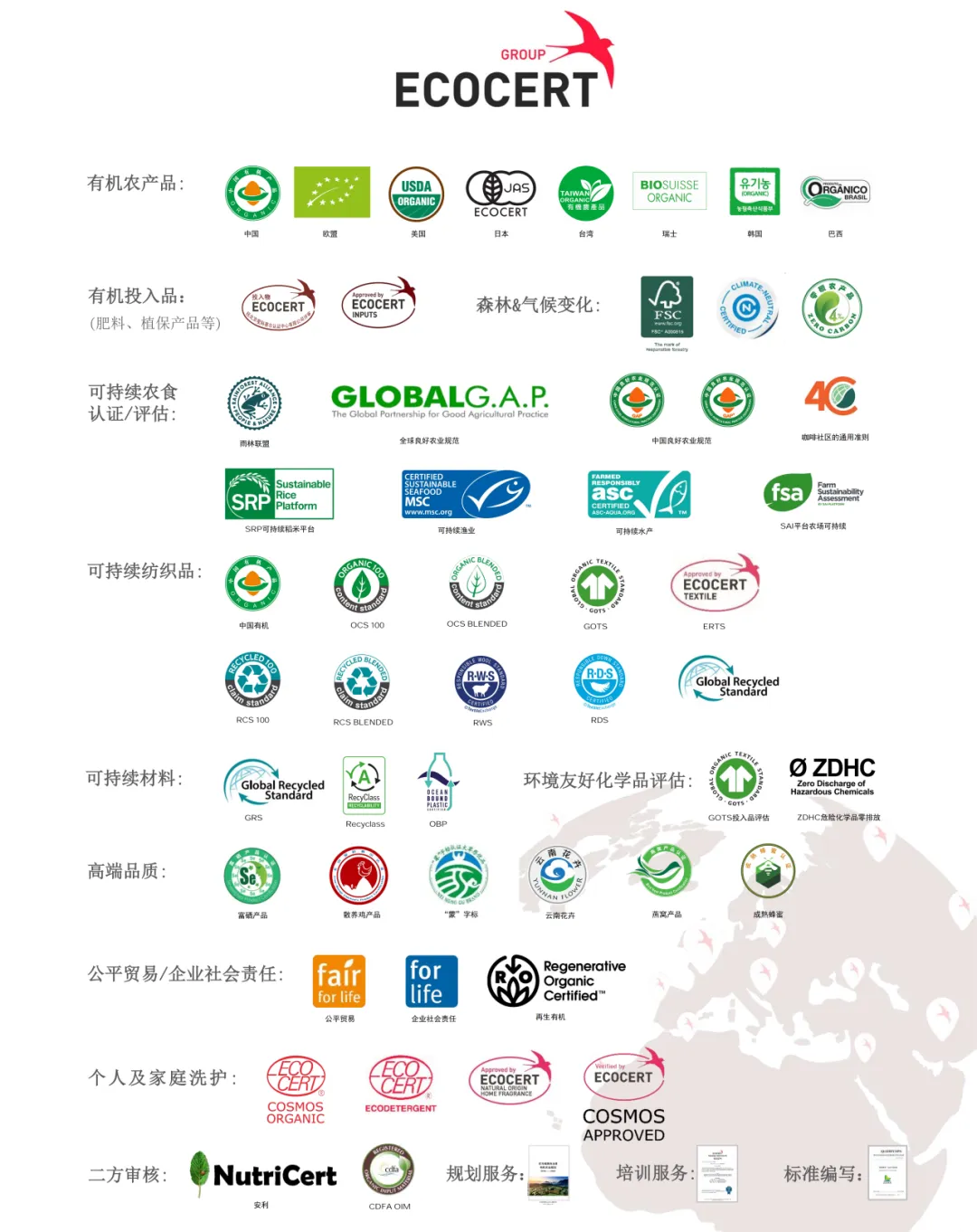 【有机产品】中国、欧盟、美国、日本、韩国、巴西、瑞士、台湾等标准认证。
