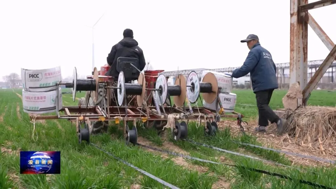在王庄镇种植大户王孟山的农田里,作业车穿梭在田垄之间,施工人员与农机协同作业,主管、支管、滴灌带有序铺设,一条条节水管网延伸至田间地头,实现水肥精准输送。