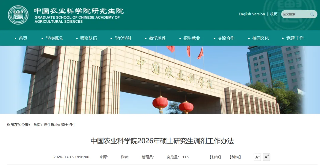 根据教育部、北京市等有关文件精神,结合中国农科院实际,制定《中国农业科学院2026年硕士研究生调剂工作办法》。