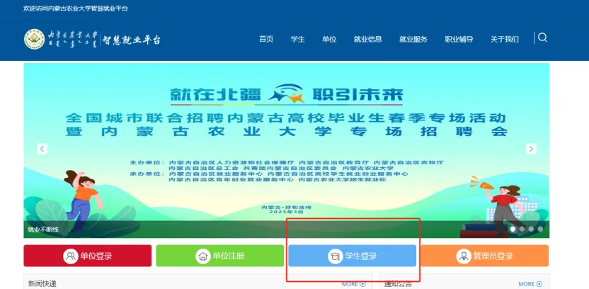 1.访问内蒙古农业大学智慧就业平台,点击“学生登录”。