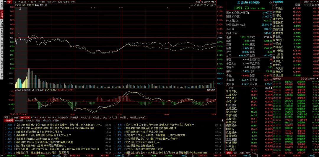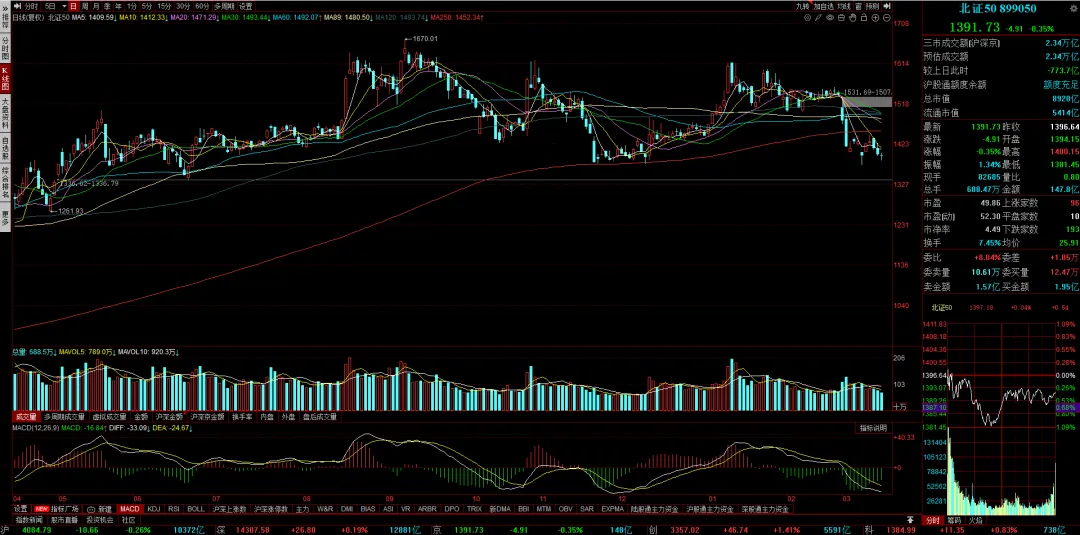 今日北证50指数跌0.35%,收报1391.73点,涨96家,跌193家,其中:涨停个股0只,炸板个股0只,表现弱于沪指(-0.26%)、深成指(0.19%)及创业板指(1.41%)。全天成交额147.80亿元,较昨日(171.90亿元)继续缩量24.10亿元,市场交投活跃度持续下降。全市场涨跌比约0.50:1,仅36只(昨日39只)个股成交量过亿,市场情绪整体偏谨慎。