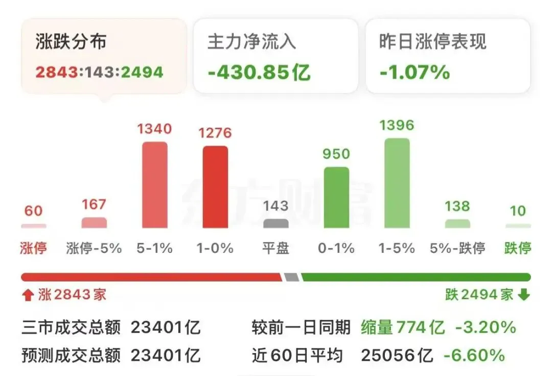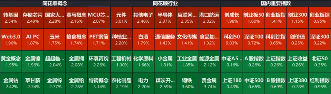 A股三大指数今日涨跌不一,截至收盘,上证指数跌0.26%,深成指涨0.19%,创业板指涨1.41%,北证50指数跌0.35%,沪深京三市成交额23399亿元,较上日缩量774亿元,三市超2800只个股上涨。 板块题材上,存储芯片、港口航运、粮食概念、白酒、PET铜箔、PCB概念、短剧游戏、跨境支付板块涨幅居前;钢铁、贵金属、草甘膦、煤炭开采加工、电力、能源金属、小金属、环氧丙烷、磷化工板块跌幅居前。