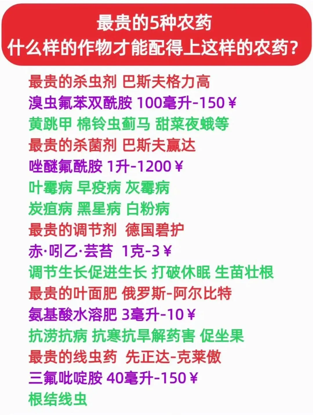 价格:1千克3000元,小规格1克约3元,堪称植物调节剂领域的“天花板”。 核心功效:功能全面,可打破种子休眠、促进生根壮苗,还能缓解药害、肥害,增强作物抗寒、抗旱、抗病虫害能力,从苗期到收获期全生育期均可使用。 适用场景:各类作物的关键生长节点,如幼苗定植后、极端天气前后、药害发生后,尤其适合高端果蔬、经济作物的优质高产栽培。 高价原因:进口原药、成分协同性强(赤霉素+吲哚乙酸+芸苔素复配),安全性高且效果稳定,研发与进口运输成本叠加导致定价偏高。