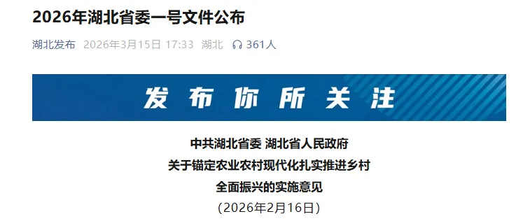 2026年是“十五五”开局之年,做好“三农”工作至关重要。要认真贯彻党的二十大和二十届历次全会精神,全面贯彻习近平总书记关于“三农”工作的重要论述和重要指示精神,深入贯彻落实习近平总书记考察湖北重要讲话精神,锚定农业农村现代化,守牢粮食安全底线,持续巩固拓展脱贫攻坚成果,提升乡村产业发展、乡村建设、乡村治理水平,扎实推进乡村全面振兴,推动城乡融合发展,努力把农业建成现代化大产业、使农村基本具备现代生活条件、让农民生活更加富裕美好,为加快建设农业强省、打造新时代“鱼米之乡”,加快建成中部地区崛起的重要战略支点提供基础支撑。