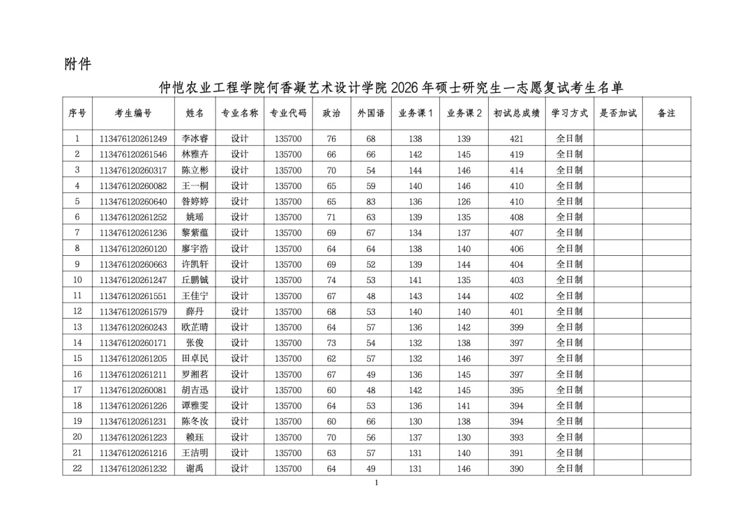 何香凝艺术设计学院2026年硕士研究生招生考试第一志愿复试考生名单