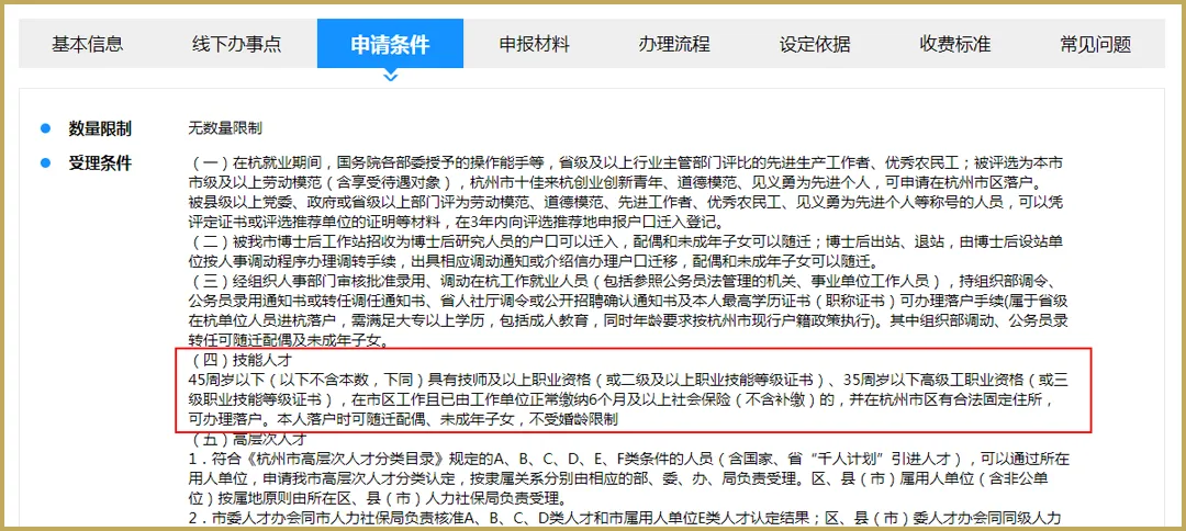 ● 杭州落户:45周岁以下(以下不含本数,下同)具有技师及以上职业资格(或二级及以上职业技能等级证书)、35周岁以下高级工职业资格(或三级职业技能等级证书),在市区工作且已由工作单位正常缴纳6个月及以上社会保险(不含补缴)的,并在杭州市区有合法固定住所,可办理落户。