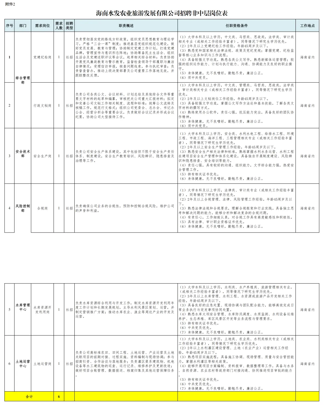 因工作需要,海南省水利水务发展集团有限公司(以下简称海南水发)下属子公司海南水发农业旅游发展有限公司(以下简称海南农旅)拟招聘6岗6人,现将有关事项公告如下: