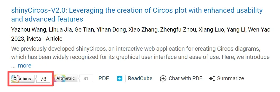 Wang, Yazhou, Lihua Jia, Ge Tian, Yihan Dong, Xiao Zhang, Zhengfu Zhou, Xiang Luo, Yang Li, and Wen Yao. 2023.“shinyCircos‐V2.0: Leveraging the creation of Circos plot with enhanced usability and advanced features.” iMeta e109. https://doi.org/10.1002/imt2.109