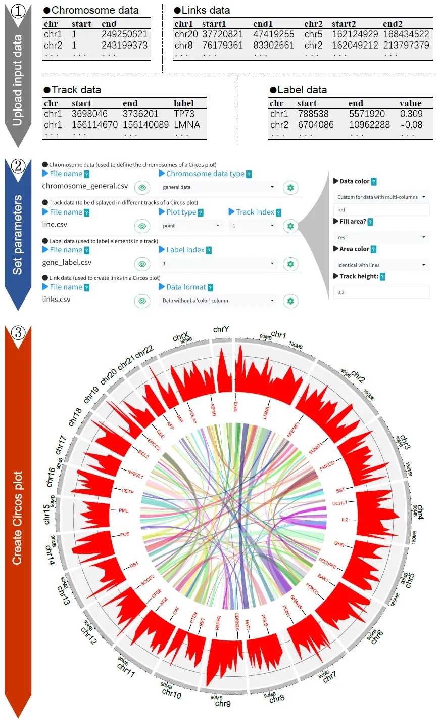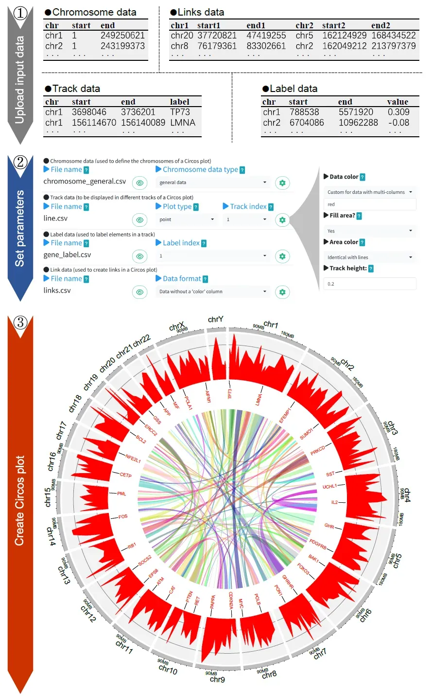 图 3. 使用shinyCircos‐V2.0创建Circos图的基本步骤说明