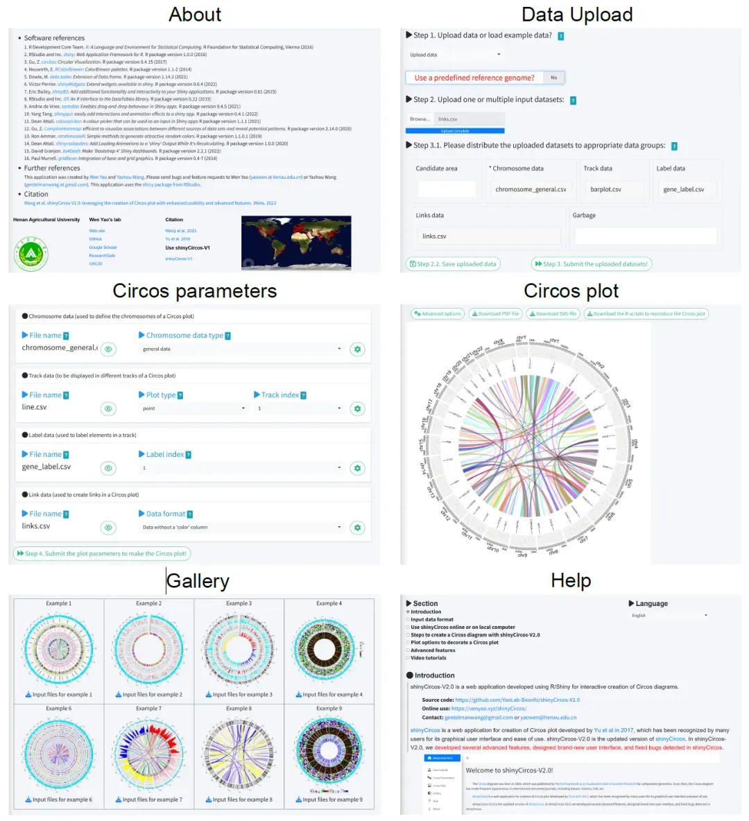 自发布以来,shinyCircos-V1 接收到了大量用户反馈,包括错误报告和新功能请求,其中大部分已得到解决。在本文中,我们主要介绍 shinyCircos-V2.0,这是 shinyCircos 的一个重要升级版本。其图形用户界面已完全重新设计,以提供更好的用户体验。此外,shinyCircos-V2.0 打破了最多输入12个数据集的限制,这是 shinyCircos-V1 中的一个不够好的地方。此外,我们在 shinyCircos-V2.0 中实现了多个高级功能,如颜色图例、轨道索引的文本标签、坐标轴标签和刻度。与shinyCircos-V1相比,shinyCircos-V2.0 在可用性和高级功能方面有很大改进。