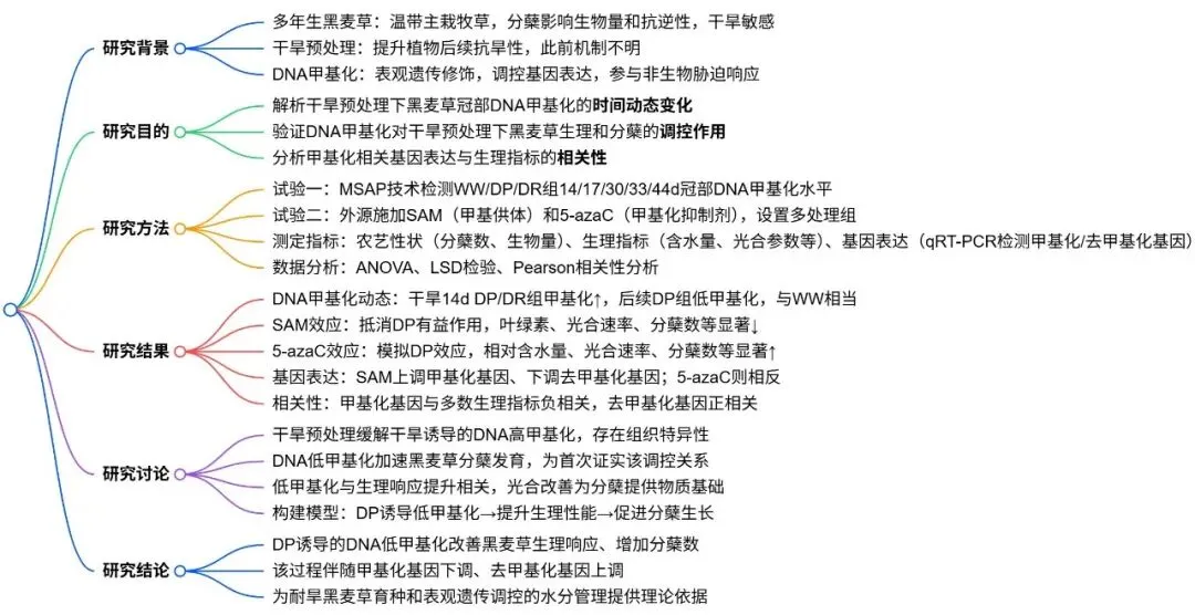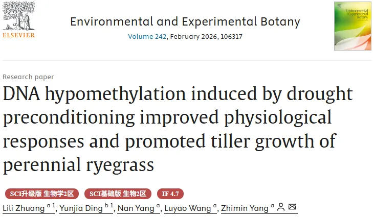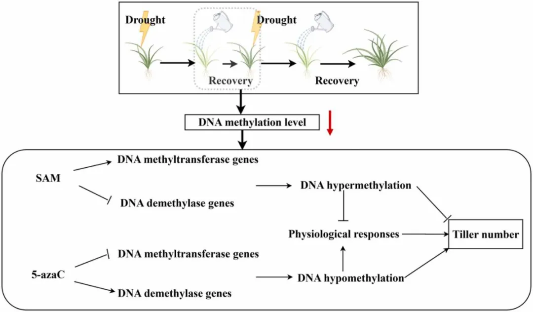 4. 揭示了多年生牧草抗逆与促生协同的表观遗传新机制。长期干旱通常会抑制植物分蘖,而干旱预处理却能反常地促进多年生黑麦草的分蘖生长,其潜在机制一直是个谜。本研究明确提出了“干旱预处理诱导的DNA去甲基化是改善多年生黑麦草生理反应并促进分蘖生长的关键机制基础”这一全新科学结论。这不仅深化了对植物非遗传性干旱适应(干旱记忆)机制的理解,也为在全球气候变化和水资源受限背景下,通过表观遗传途径培育高产、耐旱的优良牧草提供了重要的理论依据和新思路。