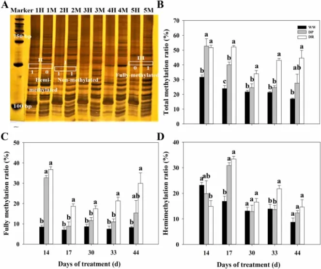 干旱期激增:经历14天首次干旱胁迫后,干旱预处理组和持续干旱组的DNA总甲基化率和全甲基化率均显著上升,而半甲基化率相应下降。