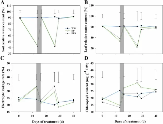 图2. 充分浇水对照(WW)、干旱预处理(DP)以及干旱预处理下喷施SAM(DPS)处理下多年生黑麦草的植物水分状况和生理指标。 (A) 土壤相对含水量(SRWC)。(B) 叶片相对含水量(LRWC)。(C) 电解质渗漏率(EL)。(D) 叶绿素含量(Chl)。数据代表三个重复的平均值。灰色阴影区域代表施用SAM的时期。垂直条表示同一天处理间比较的最小显著性差异(LSD)值(p < 0.05)。