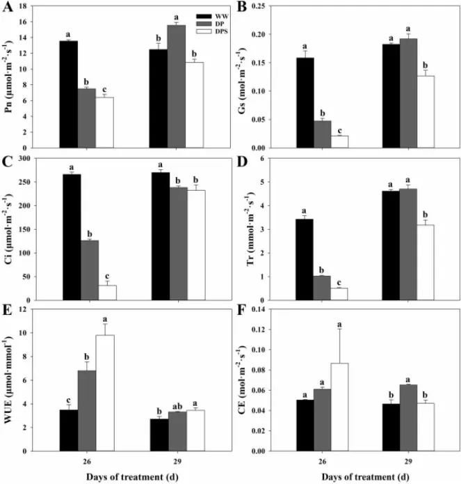 图3. 充分浇水对照(WW)、干旱预处理(DP)以及干旱预处理下喷施SAM(DPS)处理下多年生黑麦草的光合气体交换参数。 光合气体交换属性包括在第26天和第29天记录的净光合速率(Pn)(A)、气孔导度(Gs)(B)、胞间CO₂浓度(Ci)(C)、蒸腾速率(Tr)(D)、胞间水分利用效率(WUE)(E)和羧化效率(CE)(F)。数据为平均值±标准误(n = 3)。给定日期柱状图上方不同的小写字母表示处理间差异显著(p < 0.05)。