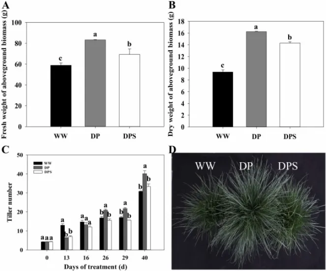 图4. 充分浇水对照(WW)、干旱预处理(DP)以及干旱预处理下喷施SAM(DPS)处理下多年生黑麦草的生物量和分蘖数。 地上部鲜重(A)和干重(B)在第40天测量。(C) WW、DP和DPS处理下不同时间间隔的分蘖数。(D) 第40天WW、DP和DPS处理下多年生黑麦草的表型。数据为平均值±标准误(n = 3)。给定日期柱状图上方不同的小写字母表示处理间差异显著(p < 0.05)。