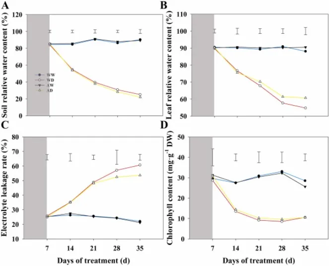 图5. 充分浇水对照(WW)、干旱处理(WD)、5-azaC预处理并充分浇水(AW)以及5-azaC预处理随后干旱处理(AD)下多年生黑麦草的植物水分状况和生理指标。 (A) 土壤相对含水量。(B) 叶片相对含水量。(C) 电解质渗漏率。(D) 叶绿素含量。数据代表三个重复的平均值。灰色阴影区域代表施用5-azaC的时期。垂直条表示同一天处理间比较的最小显著性差异(LSD)值(p < 0.05)。