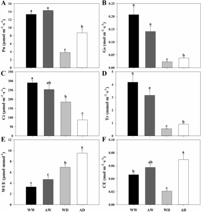 图6. 充分浇水对照(WW)、干旱处理(WD)、5-azaC预处理并充分浇水(AW)以及5-azaC预处理随后干旱处理(AD)下多年生黑麦草的光合气体交换参数。 光合气体交换属性包括在第35天记录的净光合速率(Pn)(A)、气孔导度(Gs)(B)、胞间CO₂浓度(Ci)(C)、蒸腾速率(Tr)(D)、胞间水分利用效率(WUE)(E)和羧化效率(CE)(F)。数据为平均值±标准误(n = 3)。给定日期柱状图上方不同的小写字母表示处理间差异显著(p < 0.05)。