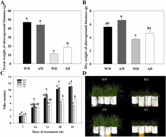 图7. 充分浇水对照(WW)、干旱处理(WD)、5-azaC预处理并充分浇水(AW)以及5-azaC预处理随后干旱处理(AD)下多年生黑麦草的生物量和分蘖数。 地上部生物量的鲜重(A)和干重(B)在第35天测量。(C) WW、WD、AW和AD处理下不同时间点单株分蘖数。(D) 第35天WW、WD、AW和AD处理下多年生黑麦草的照片。数据为平均值±标准误(n = 3)。给定日期柱状图上方不同的小写字母表示处理间差异显著(p < 0.05)。