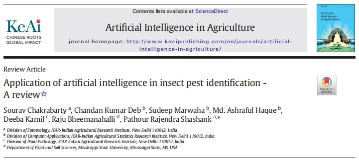 2026年3月,印度农业研究委员会Sourav Chakrabarty等在Artificial Intelligence in Agriculture期刊上发表了题为Application of artificial intelligence in insect pest identification: A review的文章,系统综述了人工智能在农业害虫识别中的研究进展,总结了机器学习与深度学习等技术在害虫图像识别中的应用,并分析了数据集、复杂环境适应性及模型泛化能力等关键挑战。