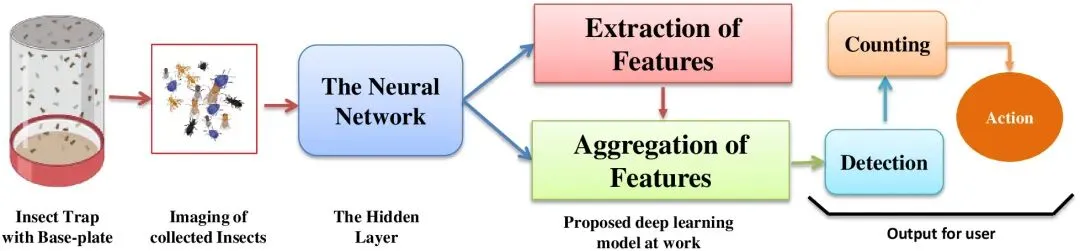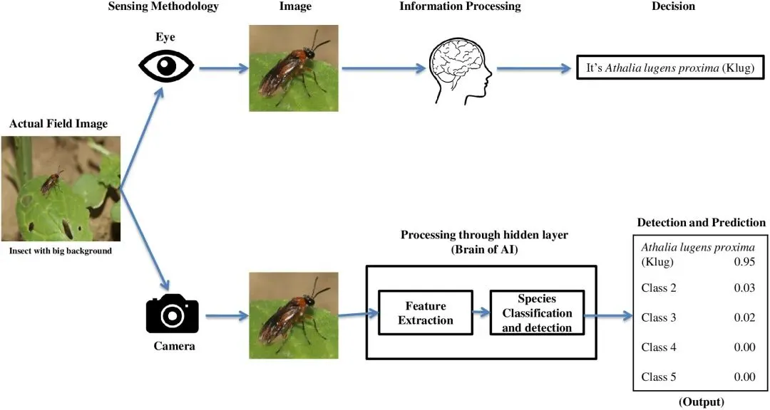人类通过眼睛获取外界图像信息,并由大脑进行复杂的信息处理与判断,从而完成对昆虫种类的识别。而在人工智能系统中,图像信息由摄像头或其它传感设备采集,再通过深度神经网络等算法模型对图像进行特征提取和模式识别,最终完成分类或检测任务。