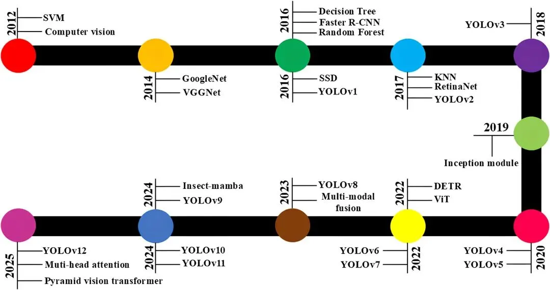 AI害虫识别技术经历了三代演进。第一代主要基于SVM、KNN等传统机器学习方法,但其泛化能力有限;第二代随着深度卷积神经网络(CNN)的兴起,如GoogleNet、VGGNet和Faster R-CNN,实现了端到端特征学习,精度显著提升;第三代则以YOLO系列(v2–v12)为代表,因在速度与精度之间取得平衡而成为主流,同时Transformer架构凭借全局注意力机制在复杂场景下展现出巨大潜力。这一发展历程反映了农业生产对模型效率与鲁棒性持续提升的需求。