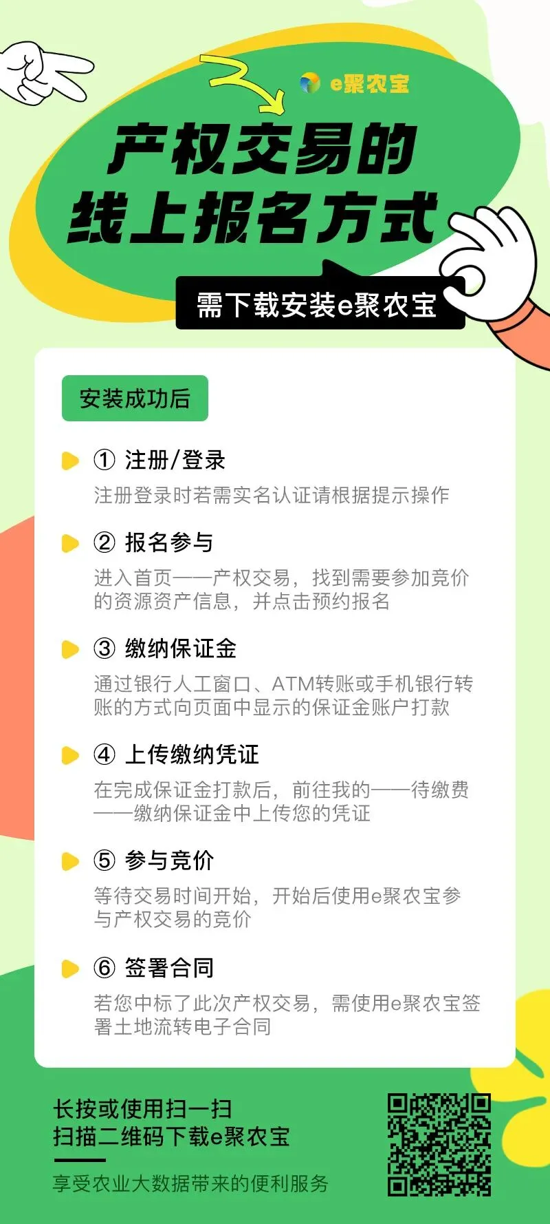报名地点:聚农宝App上报名报名操作流程第一步:扫码下载“e聚农宝”或“应用宝”直接搜索“e聚农宝”下载APP。第二步:下载完成后,点击“我的”,输入自己的手机号,并获取验证码,点击登录,输入姓名以及身份证号,完成身份验证。第三步:进入土地交易大厅,找到想要报名的地块,点击下方“预约报名”,认真读取竞价承诺书后输入验证码,完成报名。第四步:报名后系统弹出保证金缴纳账号→银行人工窗口、ATM转账、手机银行转账均可缴纳保证金,并上传缴款凭证,等待财务审核。