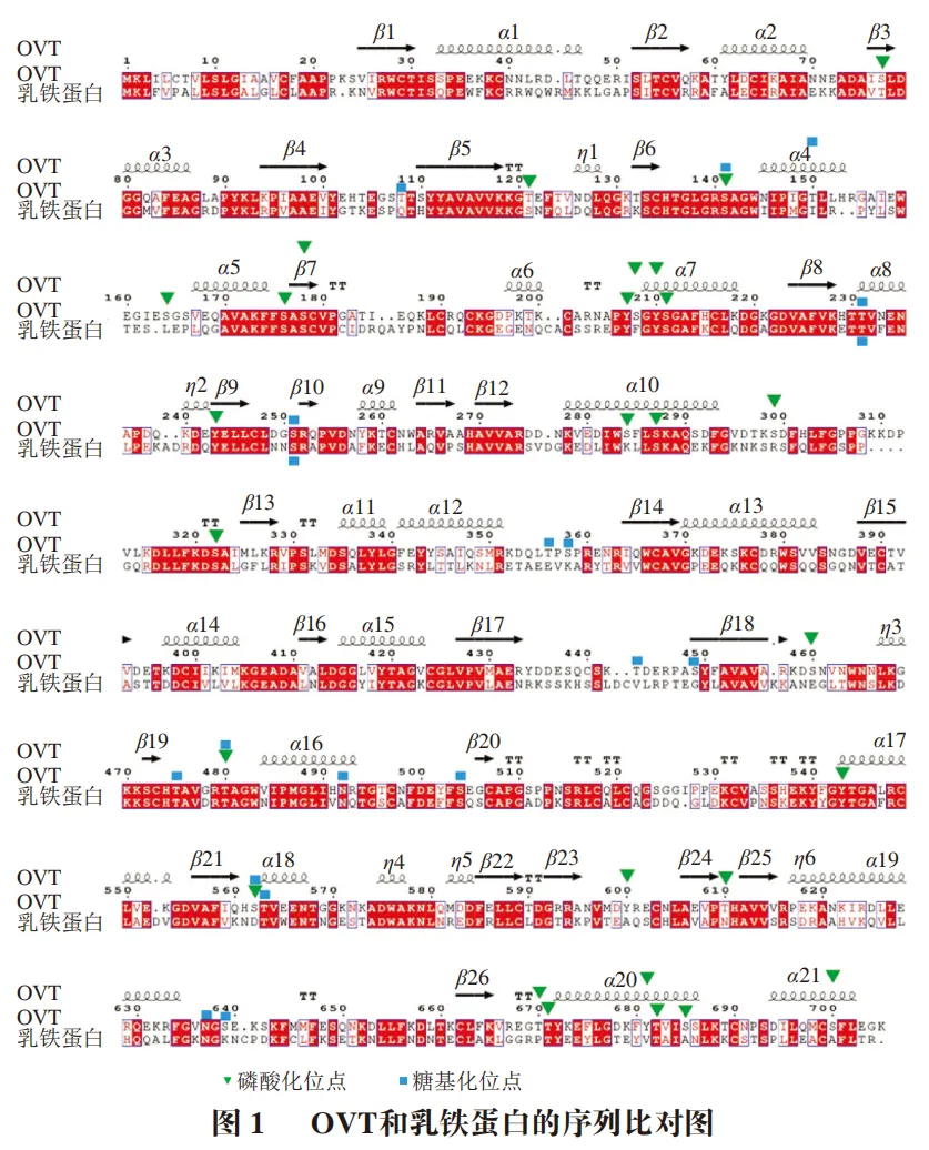 卵转铁蛋白(OVT)约占鸡蛋蛋清总蛋白质含量的12%~13%,仅次于卵清蛋白。它与人源乳铁蛋白(HLF)、牛源乳铁蛋白(BLF)、血清转铁蛋白、黑色素转铁蛋白同属转铁蛋白家族成员,且与BLF、HLF有着较高的同源性(达到50%)(图1)。此外,OVT与乳铁蛋白还具有相似的三维结构,这也使得它们具有许多类似的功能特性,如增强铁吸附、抗氧化活性、免疫调节和抗菌作用等。与乳铁蛋白相比,OVT的优势在于其在蛋清中的含量大约比牛奶中的乳铁蛋白高出140 倍,因此,从鸡蛋中提取OVT更容易。目前,OVT常用的分离纯化方法有硫酸盐沉淀法、有机溶剂沉淀法、色谱法等。