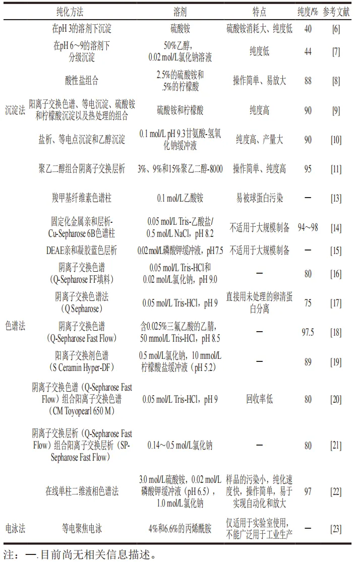 目前,从鸡蛋清中分离纯化OVT的方法有多种,主要包括沉淀法和色谱法等。